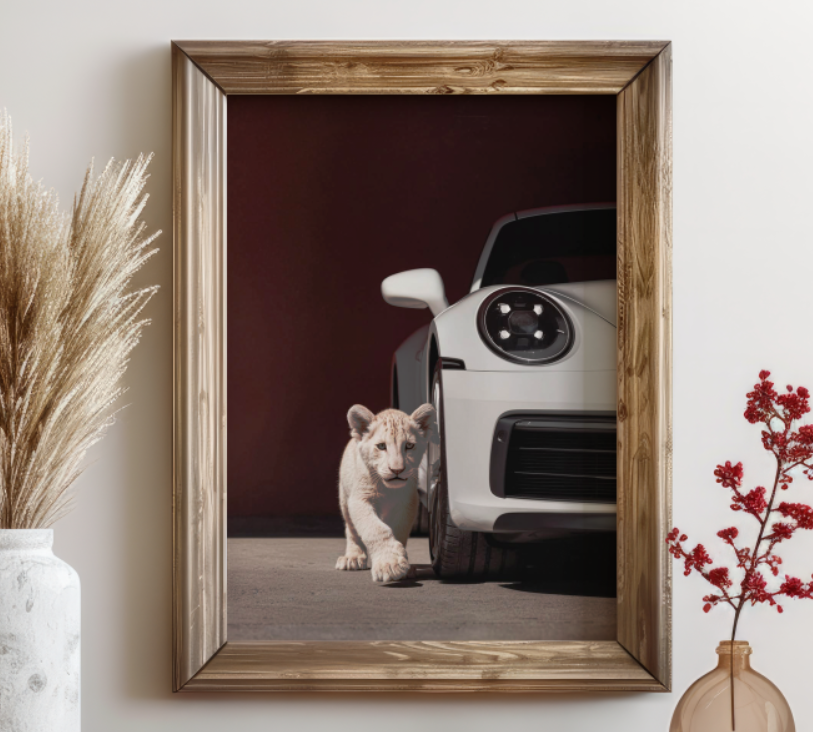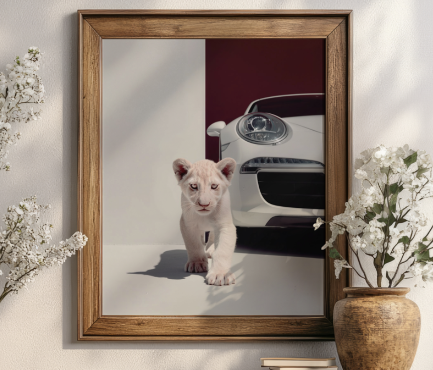 Add a touch of whimsy and elegance to your space with this canvas print featuring a cute white lion cub curiously approaching a sleek black Porsche on a split-color background. A high-quality surreal reproduction blending innocence and sophistication, perfect for contemporary or eclectic decor. Available in multiple sizes for easy integration.
