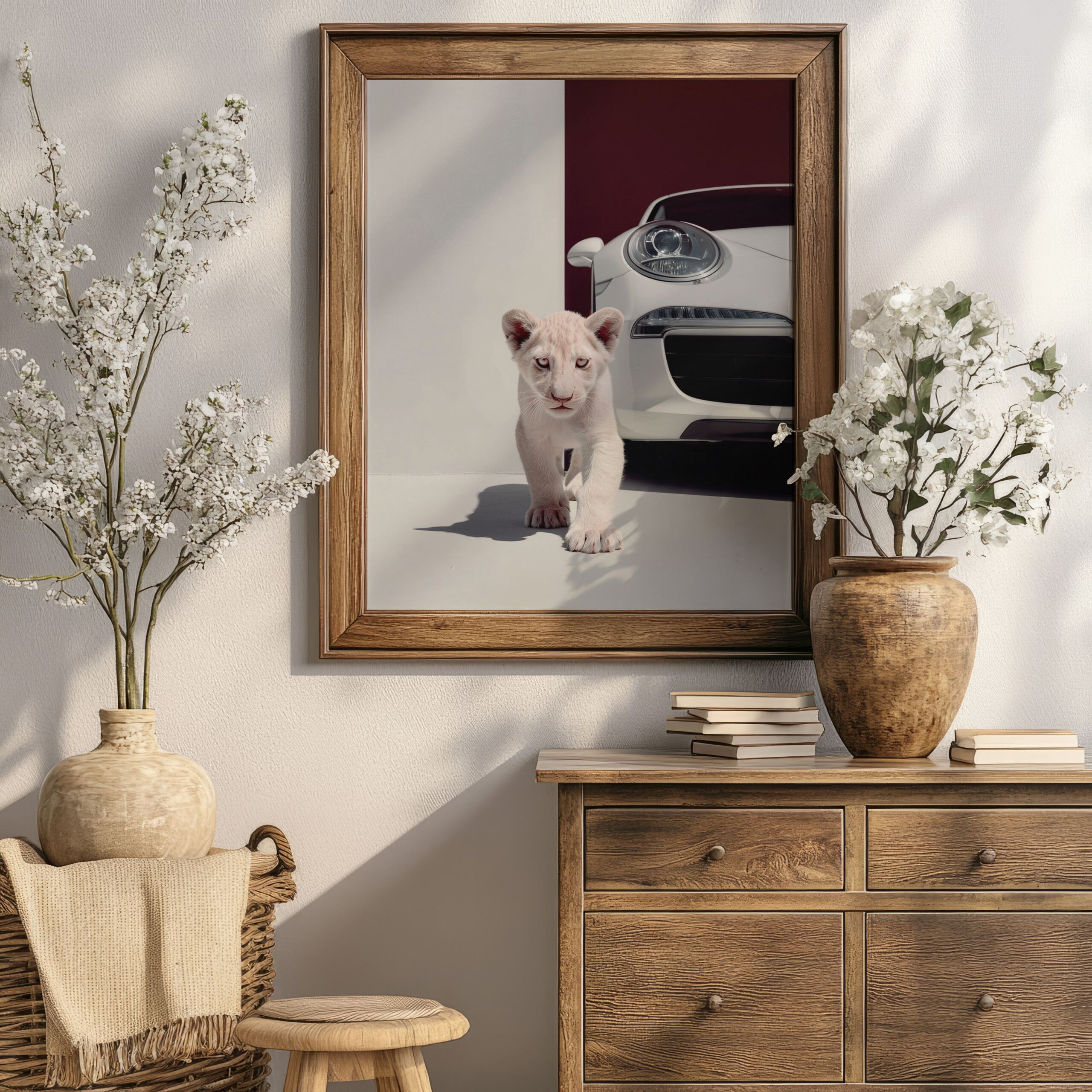 Delight in the charming contrast of nature and modernity with our “Adorable White Lion Cub Meets Porsche” canvas wall art print. This enchanting artwork captures a fluffy white lion cub with wide-eyed curiosity stepping toward a glossy black Porsche sports car, set against a striking split background—crisp white on one side fading into deep maroon on the other, symbolizing the meeting of wild purity and refined power. Crafted in a premium oil painting style with soft textures, subtle shadows, and vibrant details, it brings a playful yet sophisticated vibe to living rooms, nurseries, or home offices, appealing to animal lovers, car enthusiasts, or those seeking unique statement pieces.