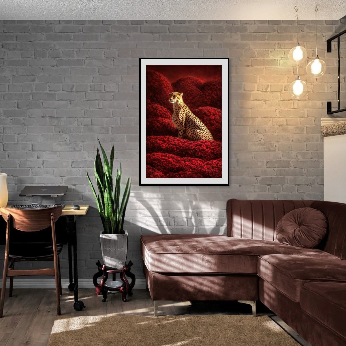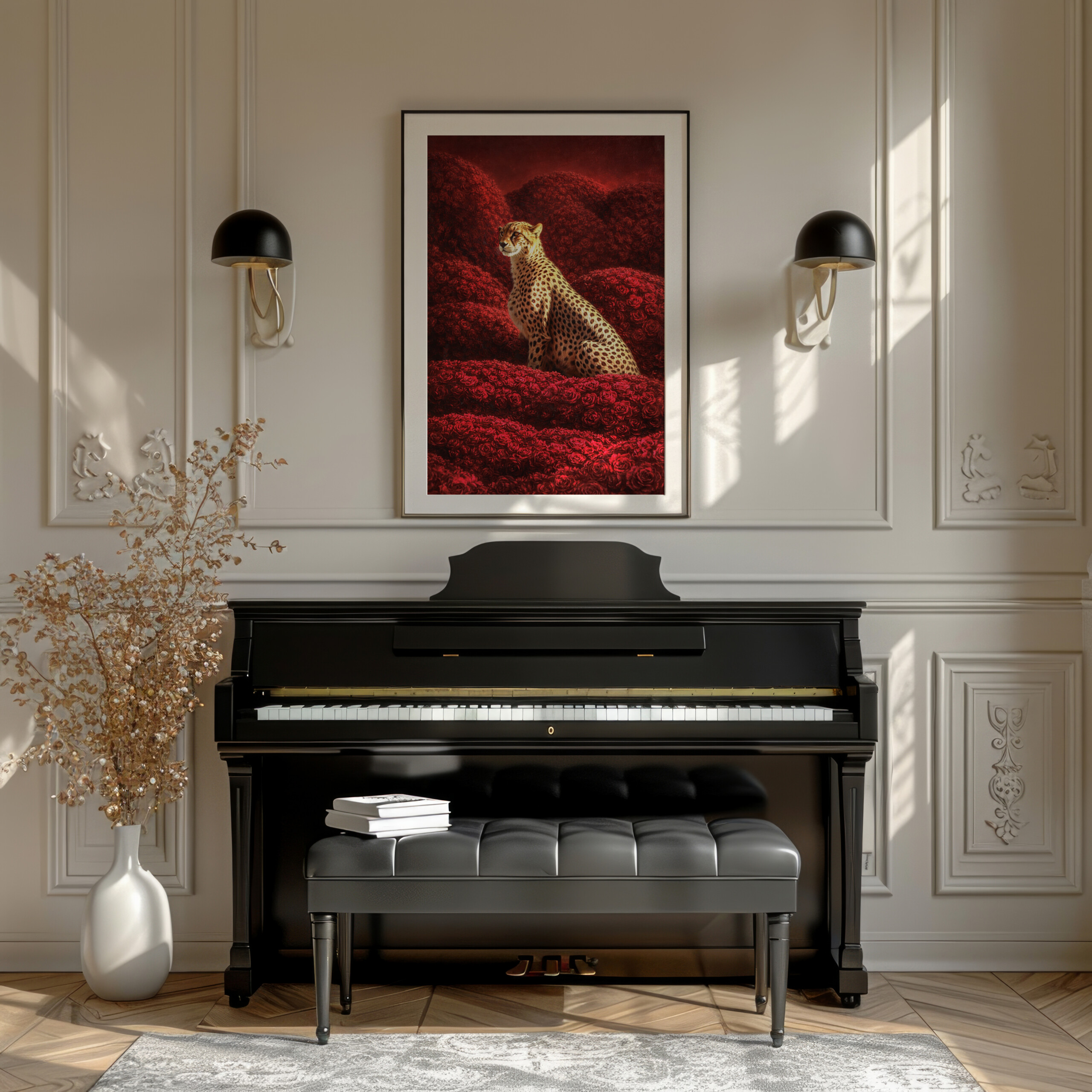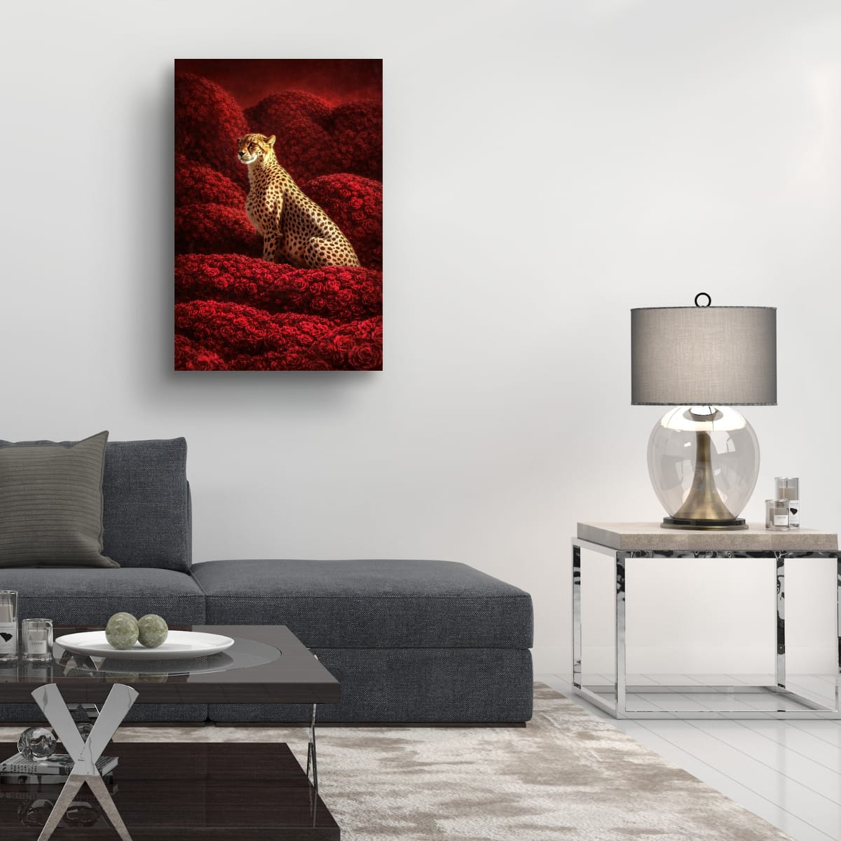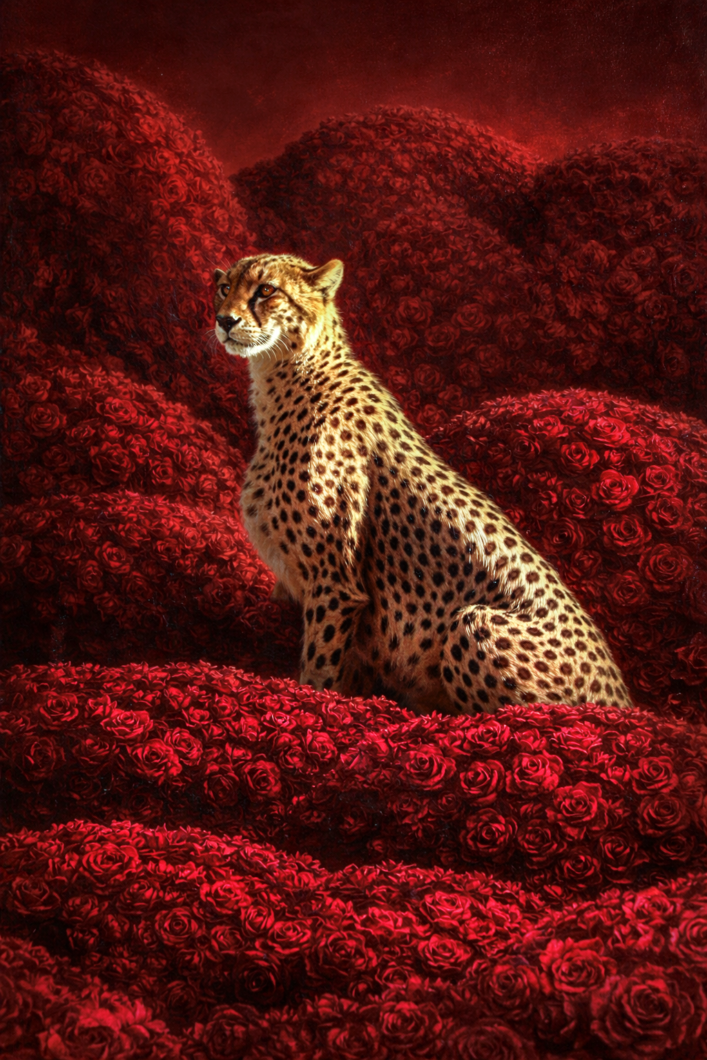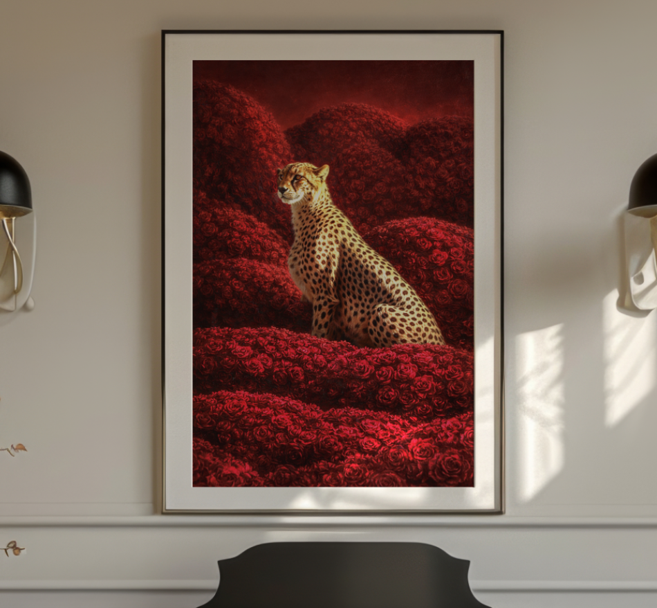 In “Cheetah in Roses,” a majestic cheetah emerges gracefully from a lush sea of vibrant red roses, embodying both strength and elegance. The striking contrast between the animal’s distinctive spots and the rich floral backdrop creates a captivating visual narrative. This artwork invites contemplation on the harmony between nature’s beauty and the wild spirit of the cheetah. A stunning addition to any space, it brings a touch of sophistication and intrigue.