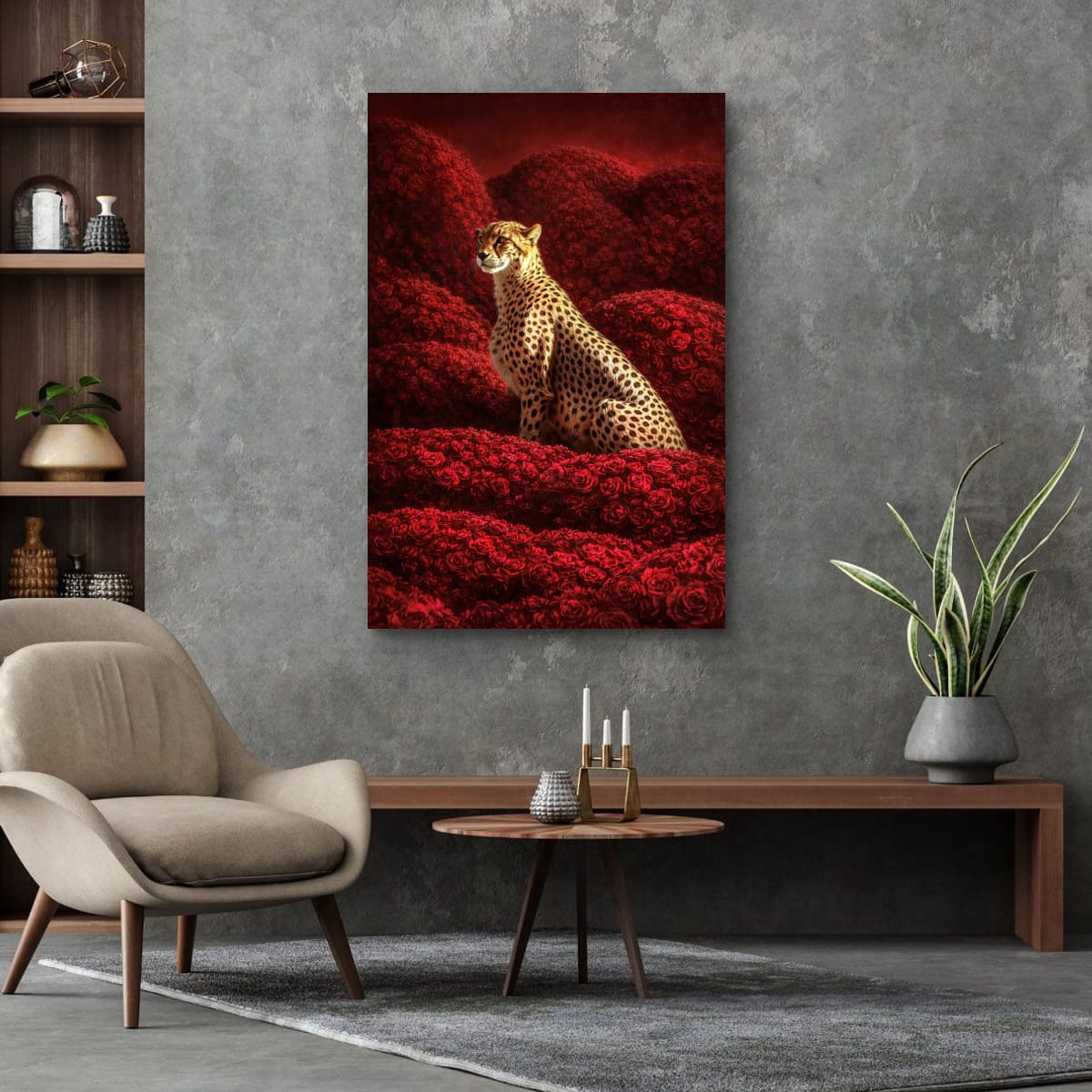 In “Cheetah in Roses” a striking cheetah emerges from a lush expanse of vibrant red roses, embodying a unique blend of strength and grace. The dynamic interplay between the animal’s distinctive spots and the rich floral backdrop creates a compelling visual narrative. This artwork reveals the harmony between the wild spirit of the cheetah and the delicate beauty of nature. Perfect for enhancing any space, it adds a touch of sophistication and intrigue to your decor.