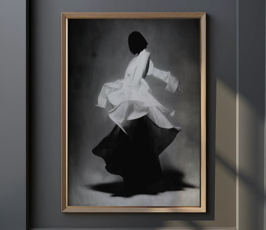 Capture the essence of fluid movement with this canvas print of a twirling female dancer in striking black and white. An elegant, minimalist oil-style reproduction that adds poetic grace and sophistication to any space. Perfect for interiors seeking artistic depth and serenity. Available in various sizes for versatile display.