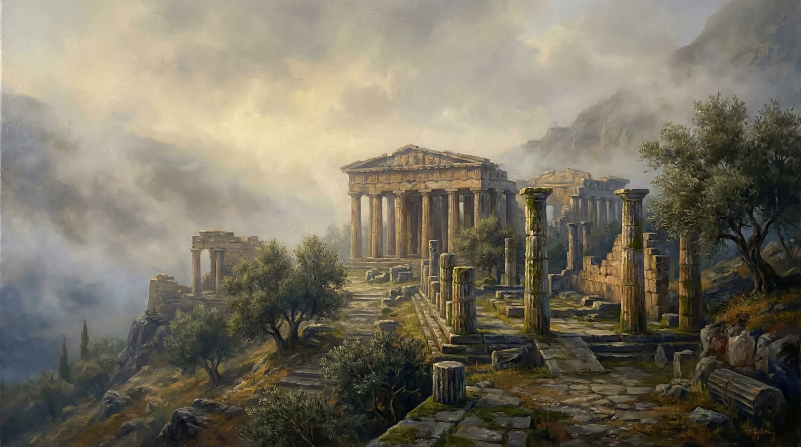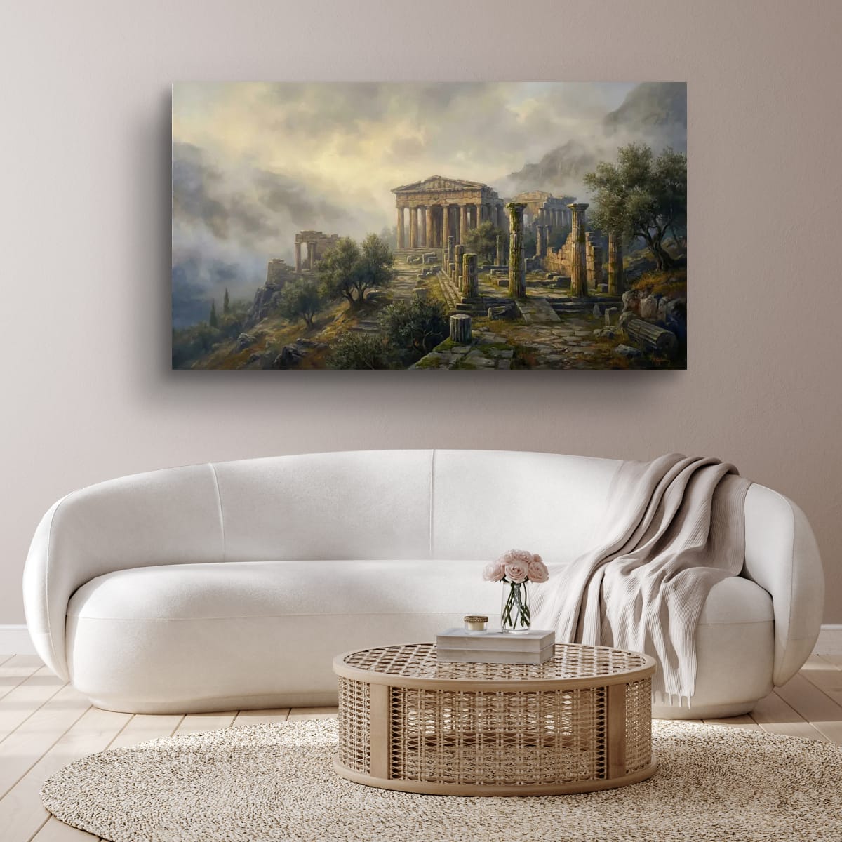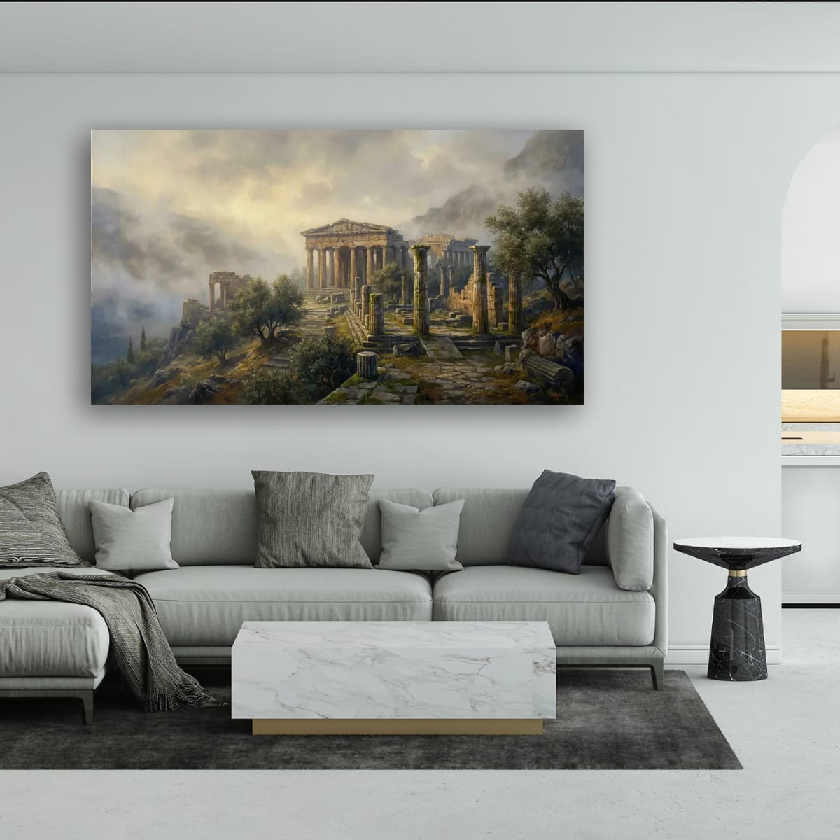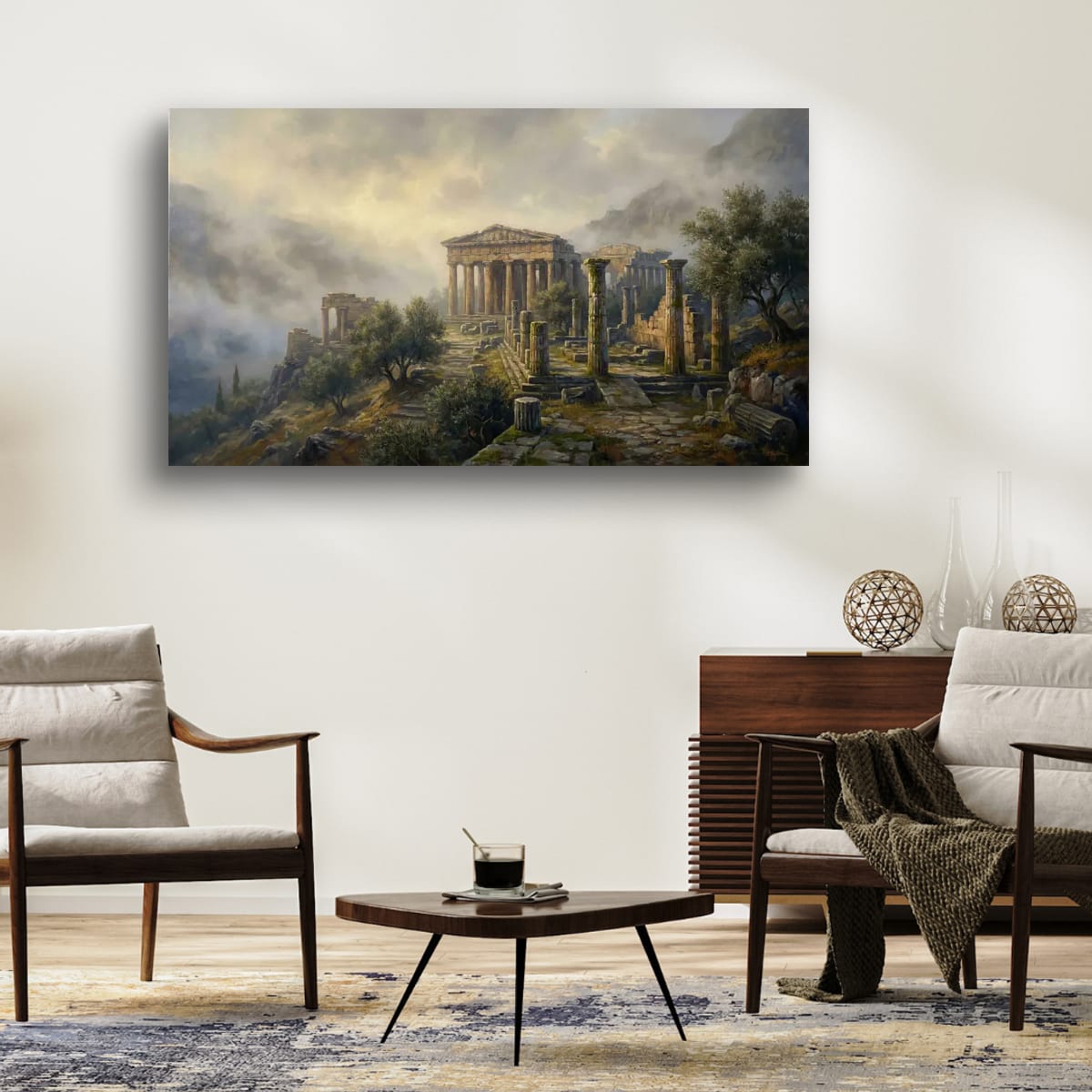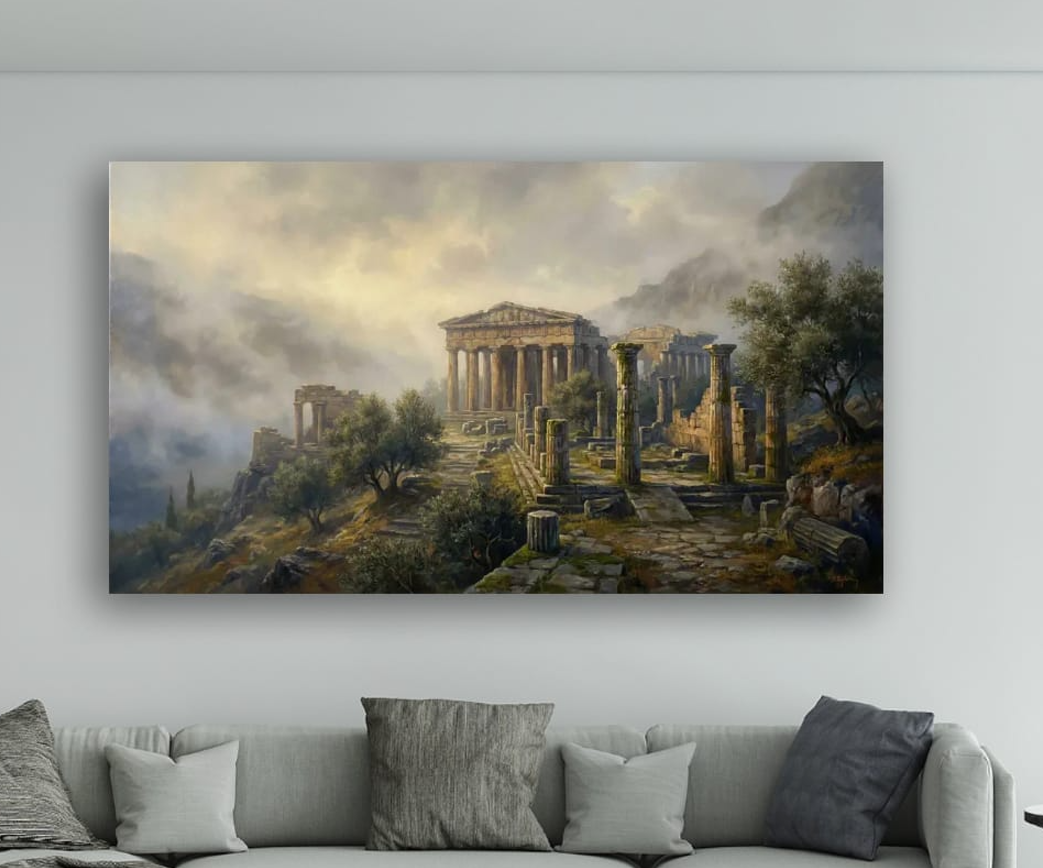 This artwork reveals a tranquil landscape of ancient ruins, where grand columns stand tall against a backdrop of ethereal mountains shrouded in mist. The delicate balance of light and shadow creates a mystical ambiance, encouraging reflection on a rich historical narrative. Olive trees punctuate the scene, infusing a sense of life into the enduring architecture. This piece conveys a deep sense of serenity and heritage, making it an intriguing addition to any space.